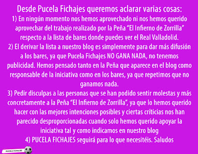 2) El derivar la lista a nuestro blog es simplemente para dar más difusión a los bares, ya que Pucela Fichajes NO GANA NADA, no tenemos publicidad. Hemos pensado tanto en la Peña que aparece en el blog como responsable de la iniciativa como en los bares, ya que repetimos que no ganamos nada.